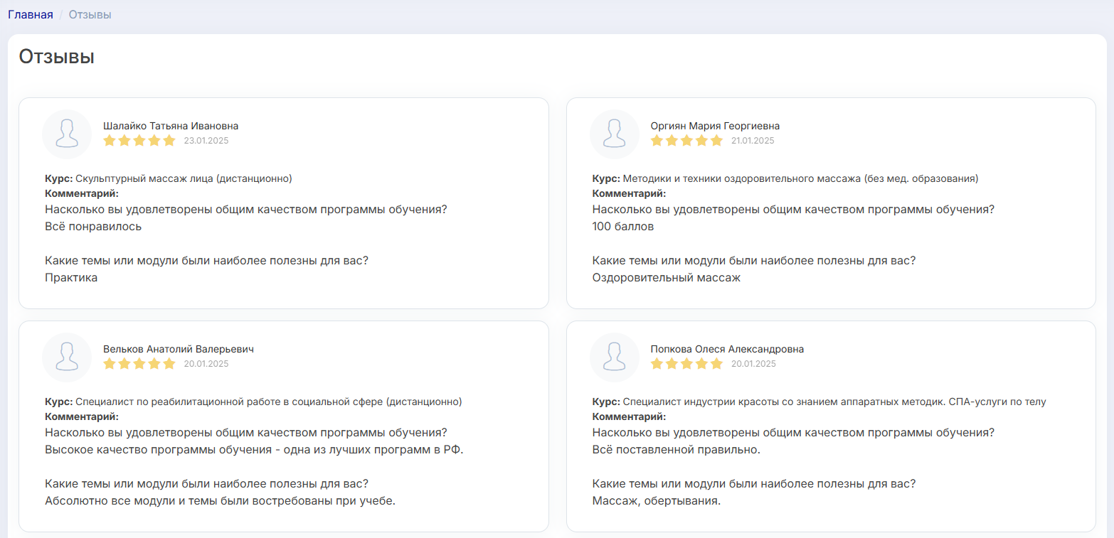 - "Отзывы" — отзывы, оставленные клиентами по пройденным курсам и семинарам.